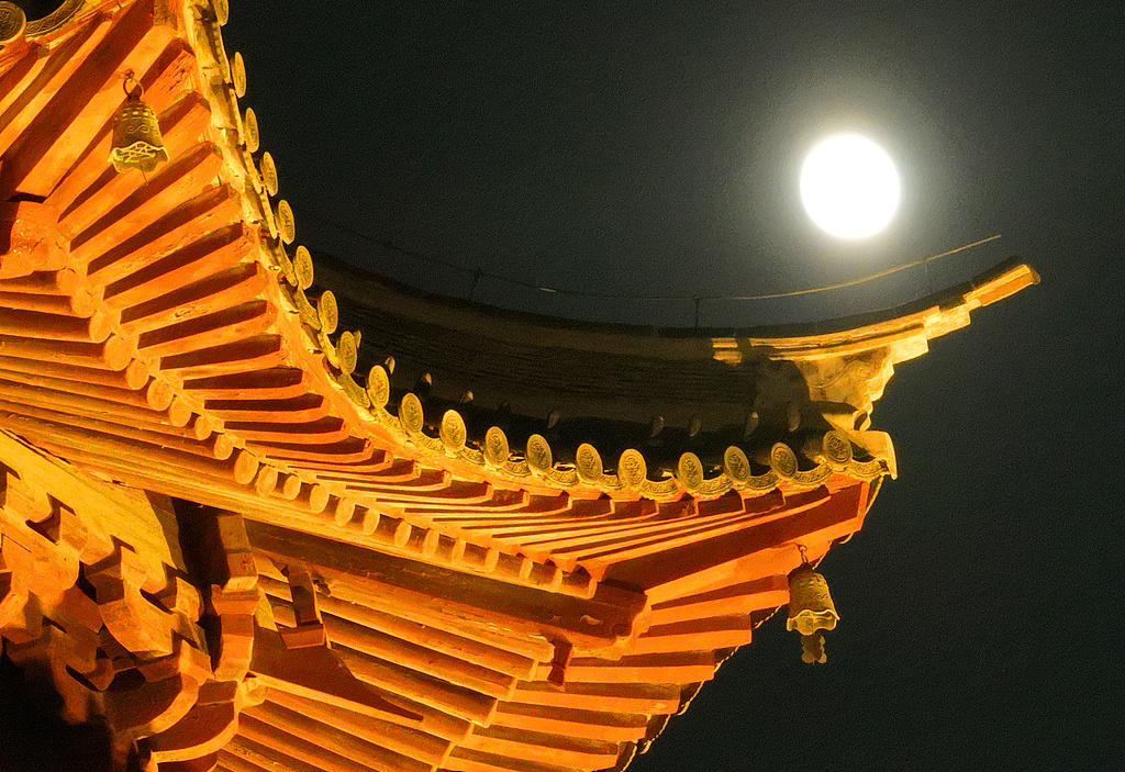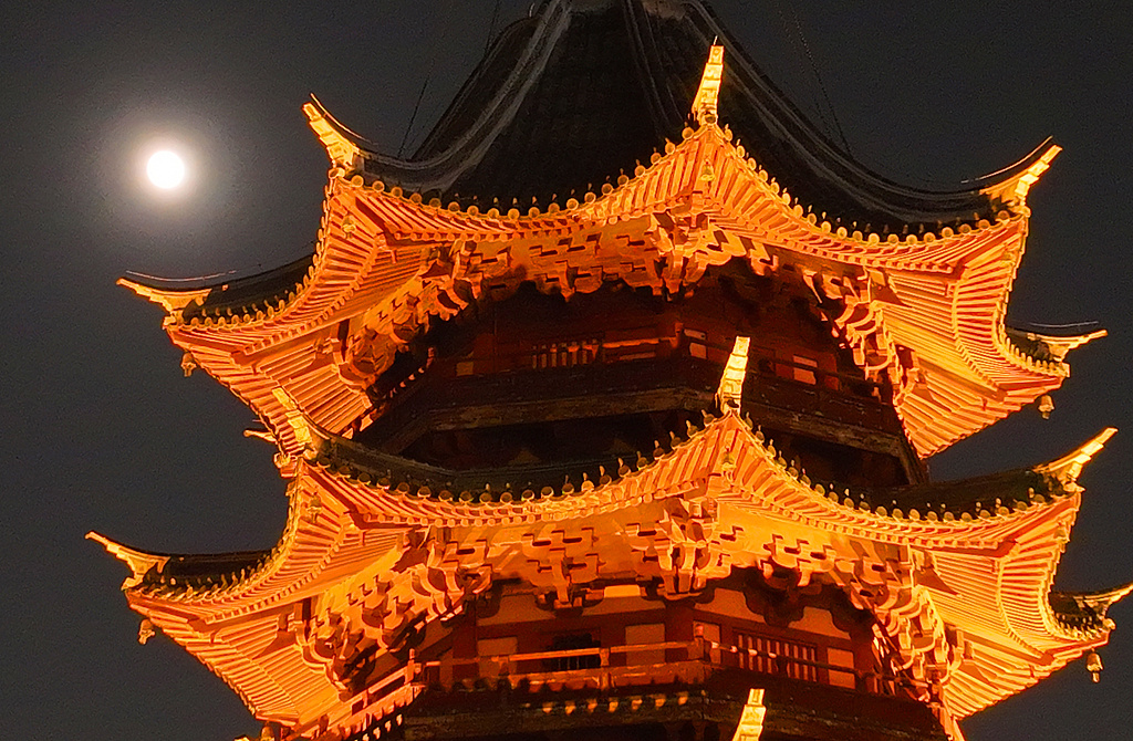 一輪圓月從浙江省臺(tái)州市仙居縣安洲塔上空升起。