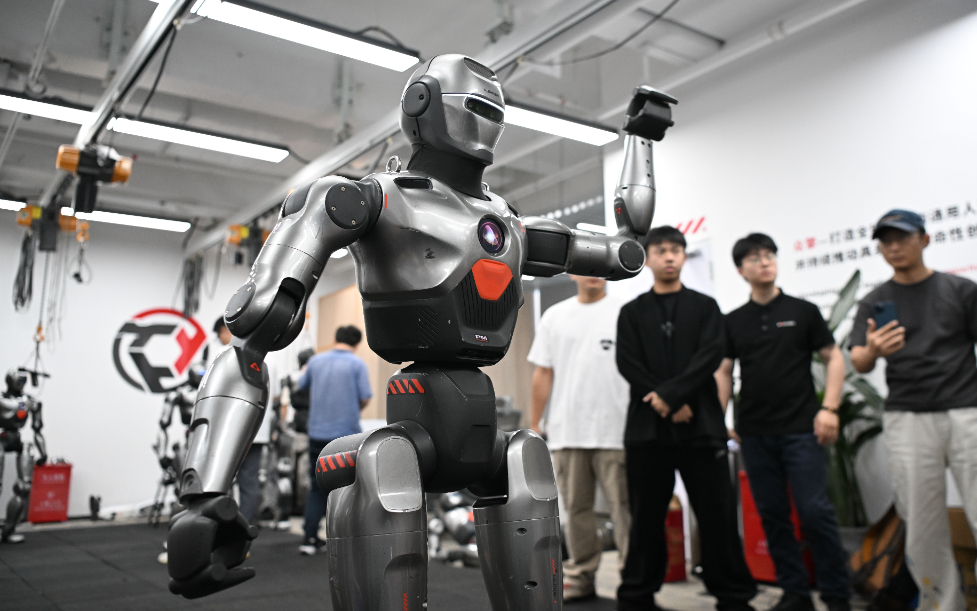6月25日,在深圳市眾擎機(jī)器人科技有限公司,人形機(jī)器人揮舞手臂致意。新華社記者 鄧華 攝