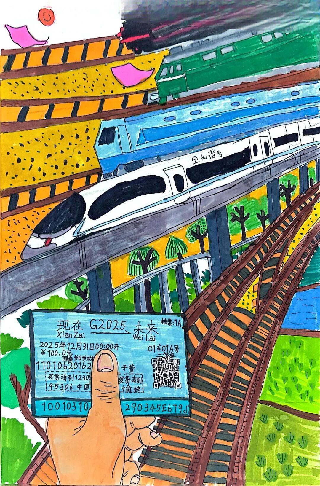 現(xiàn)在我坐在復(fù)興號(hào)里,看電子屏上顯示列車時(shí)速達(dá)到350公里,青檀樹(shù)在窗外連成流動(dòng)的綠瀑。乘務(wù)員推著餐車經(jīng)過(guò),玻璃幕墻外閃過(guò)曲阜孔廟的金色鴟吻。包里裝著曾曾祖父的鐵路修建圖影印件,那些泛黃的等高線正被新時(shí)代的測(cè)繪儀重新勾勒。