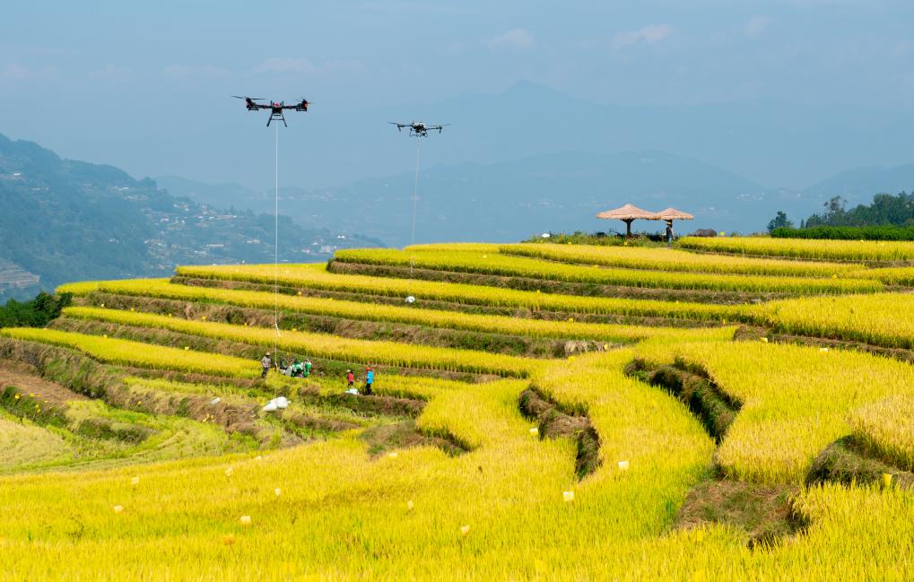 10月10日,湖北省秭歸縣沙鎮(zhèn)溪鎮(zhèn)長(zhǎng)春村村民用無人機(jī)轉(zhuǎn)運(yùn)收獲的水稻(無人機(jī)照片)。新華社發(fā)(雷勇攝)