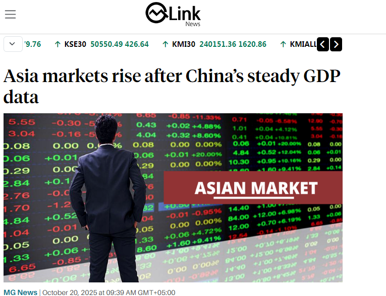 巴基斯坦金融網(wǎng)站Mettis Global Link發(fā)表題為《亞洲股市響應(yīng)中國(guó)穩(wěn)健GDP數(shù)據(jù)普漲》的文章。文章分析稱,亞洲市場(chǎng)20日迎來(lái)開門紅,得益于中國(guó)的最新經(jīng)濟(jì)數(shù)據(jù)。中國(guó)第三季度GDP同比增長(zhǎng)4.8%,同時(shí)維持貸款市場(chǎng)報(bào)價(jià)利率(LPR)。股市方面,香港恒生指數(shù)大漲逾2%,內(nèi)地滬深300指數(shù)上漲0.74%。日經(jīng)225指數(shù)飆升近3%,首次突破49000點(diǎn)大關(guān),東證指數(shù)上漲2%。
