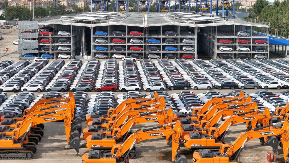 10月20日,國(guó)產(chǎn)汽車和工程機(jī)械在山東港口煙臺(tái)港集結(jié)等待裝船出口(無人機(jī)照片)。新華社發(fā)(唐克 攝)