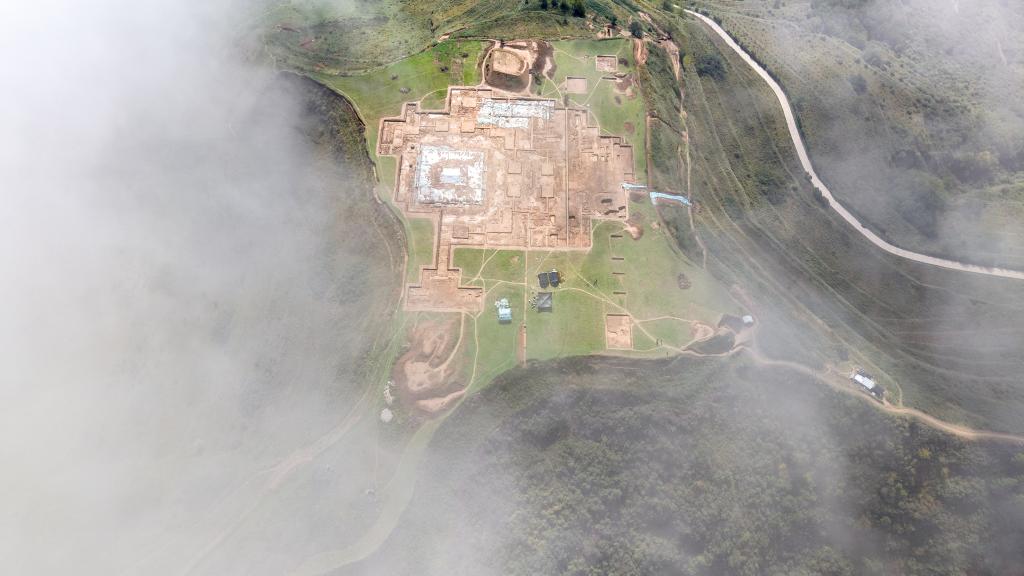 這是10月15日拍攝的甘肅省隴南市禮縣四角坪遺址考古發(fā)掘現(xiàn)場(chǎng)(無人機(jī)照片)。新華社記者 郎兵兵 攝