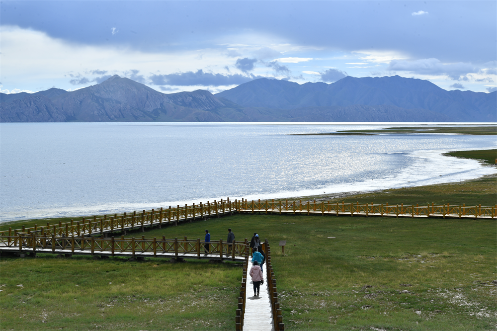 △ 游客行走在青?,敹嗫h冬格措納湖畔的木棧道上。