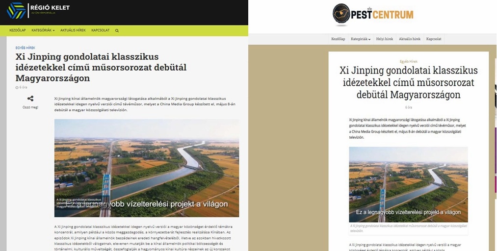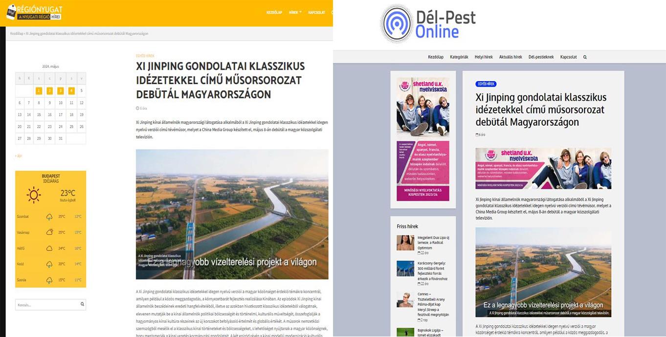 此外,當(dāng)?shù)貢r(shí)間5月4日,匈牙利東部生活網(wǎng)、匈牙利佩斯中心網(wǎng)、匈牙利西峰網(wǎng)、南佩斯在線網(wǎng)等對(duì)《平“語(yǔ)”近人——習(xí)近平喜歡的典故》(國(guó)際版)即將播出的消息進(jìn)行了報(bào)道。匈牙利東部生活網(wǎng)主要以介紹亞洲以及中東歐地區(qū)內(nèi)容為主,在匈牙利擁有廣泛的受眾群體。匈牙利佩斯中心網(wǎng)是布達(dá)佩斯地區(qū)最主要的商業(yè)媒體網(wǎng)站。