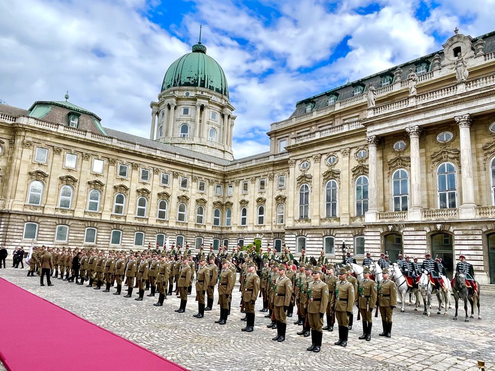初夏時節(jié)的布達佩斯陽光明媚,古老宏偉的布達王宮莊嚴(yán)矗立,中匈兩國國旗相映成輝。習(xí)近平和夫人彭麗媛乘坐的國賓車隊在匈牙利禮賓馬隊護衛(wèi)下緩緩駛?cè)氩歼_王宮內(nèi)庭。舒尤克總統(tǒng)夫婦和歐爾班總理夫婦熱情迎接。