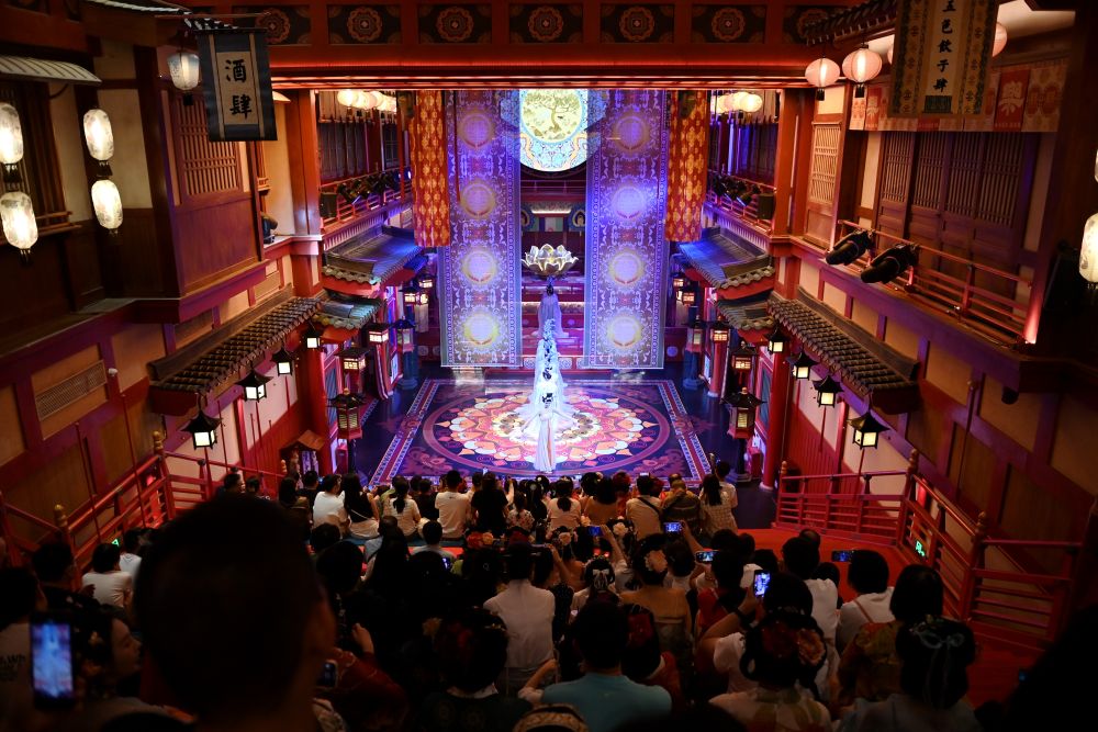 2024年5月12日,游客在西安長安十二時(shí)辰主題街區(qū)內(nèi)觀看演出。新華社記者 李一博 攝