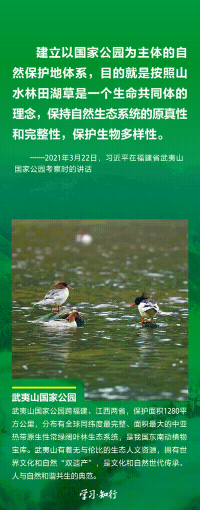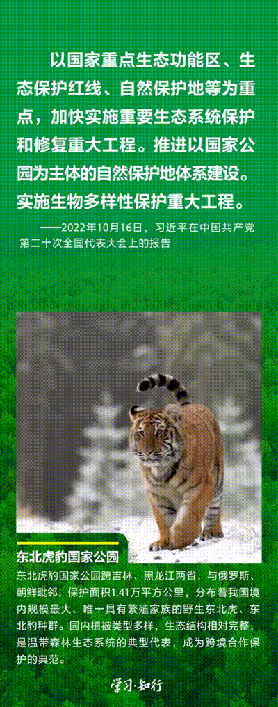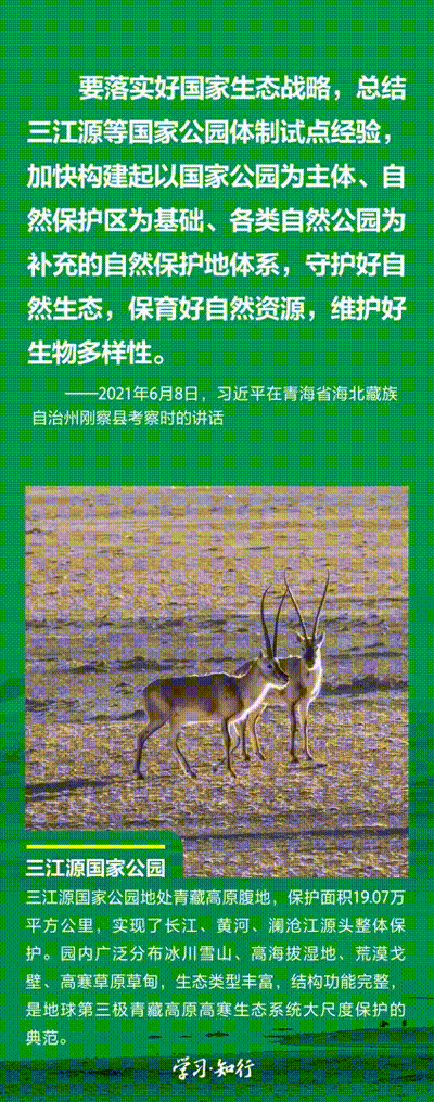 “生物多樣性使地球充滿生機(jī),也是人類生存和發(fā)展的基礎(chǔ)?!蓖七M(jìn)以國(guó)家公園為主體的自然保護(hù)地體系建設(shè),是習(xí)近平總書記作出的重要部署。三江源、大熊貓、東北虎豹、海南熱帶雨林、武夷山等首批國(guó)家公園正式設(shè)立以來(lái),生態(tài)功能持續(xù)向好,對(duì)保護(hù)生物多樣性、推進(jìn)人與自然和諧共生的現(xiàn)代化具有重要意義。