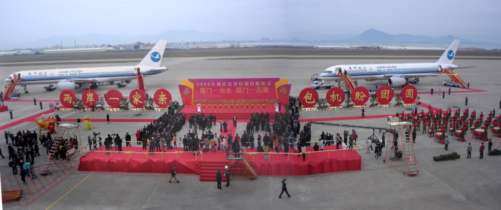 2006年,廈航作為新增廈門航點的唯一運營航空公司,執(zhí)行了廈門-臺北、廈門-高雄航線的包機任務(wù)。這是首航儀式現(xiàn)場。