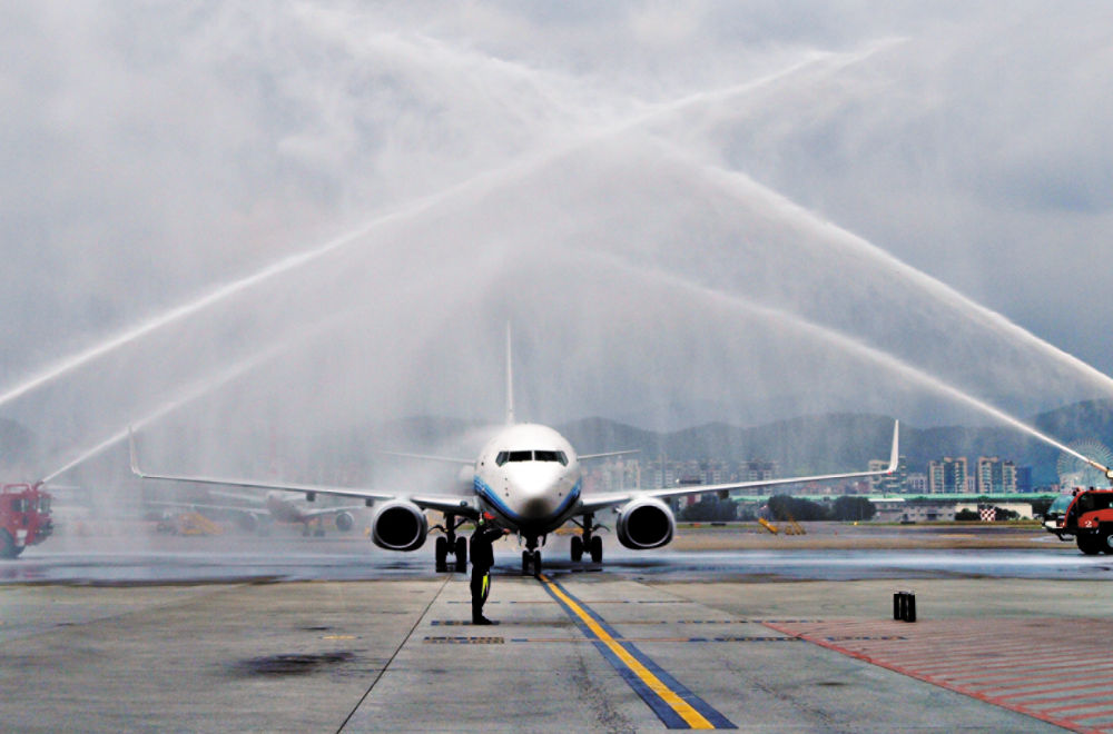 2008年,兩岸“三通”啟動常態(tài)包機,廈航成為廈門、福州和杭州航點的運營航空公司。這是2008年12月15日,臺北松山機場以“水門”儀式迎接廈航常態(tài)化包機。