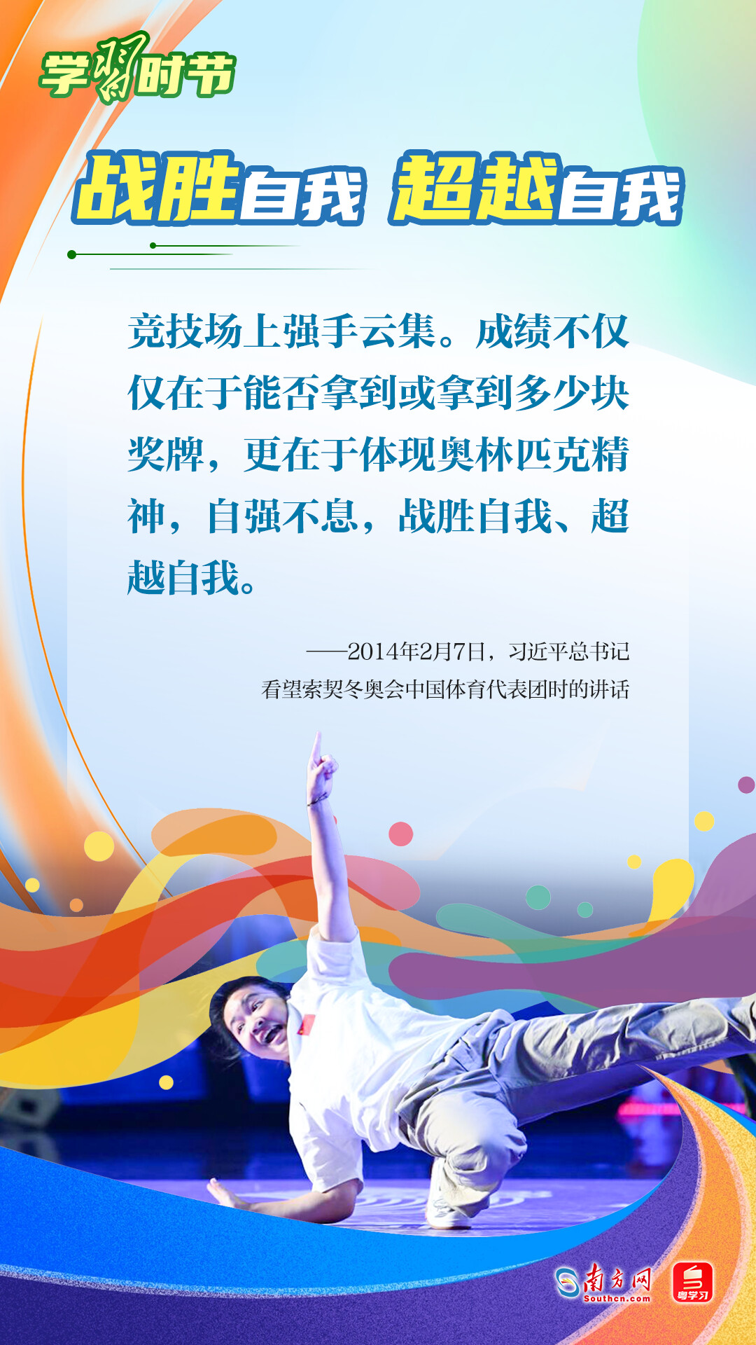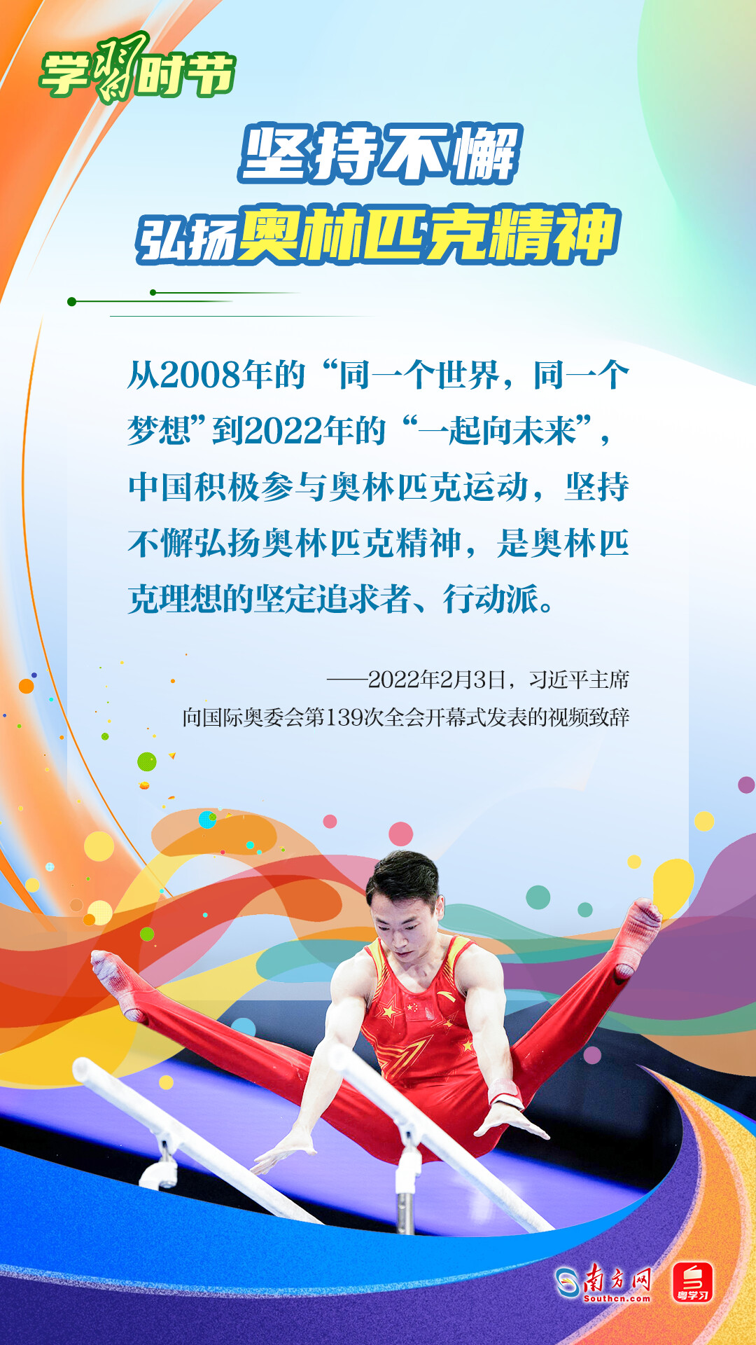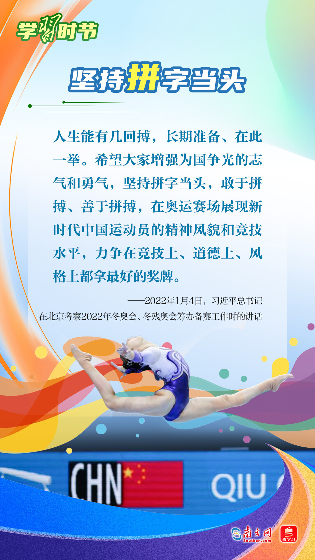 “我們不以勝負論英雄,同時英雄就要敢于爭先、敢于爭第一?!绷暯娇倳浽诓煌瑘龊险撌鰥W林匹克精神,深刻闡明了勝與負、成與敗的辯證關(guān)系,對奧林匹克“更快、更高、更強——更團結(jié)”的格言進行詮釋。讓我們一同學習習近平總書記對奧林匹克精神的重要論述,心懷夢想、奮勇拼搏,攜手走向美好明天。