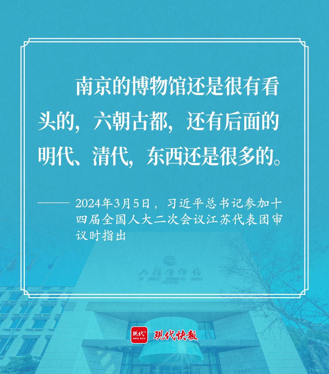 2024年3月5日,習(xí)近平總書記參加十四屆全國人大二次會議江蘇代表團(tuán)審議??倳浽诼犕昴暇┦胁┪锟傪^副館長宋燕代表講述后表示,“南京的博物館還是很有看頭的,六朝古都,還有后面的明代、清代,東西還是很多的。”