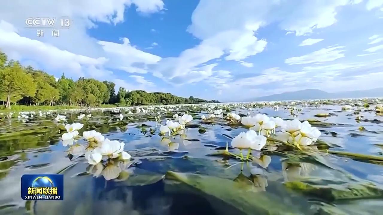 云南大理,洱海湖面,連片海菜花在水面綻放,吸引了大批游客前來(lái)打卡。