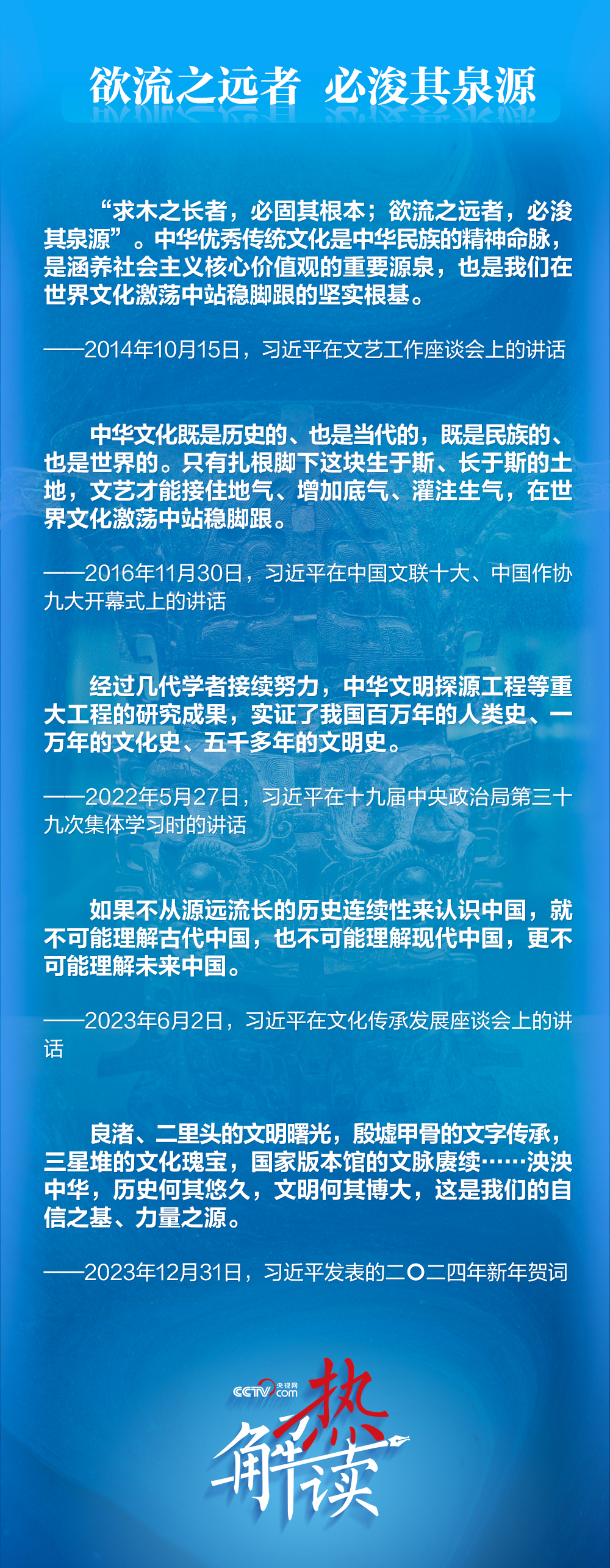 一件件文物、一處處文化古跡、一項項文化藝術,串連起中華民族的文化史,蘊藏著“何以中國”的文化力量??倳泴χ腥A文明之源的關注,彰顯的正是他對推動文化繁榮、建設文化強國的深刻思考和文化自信。