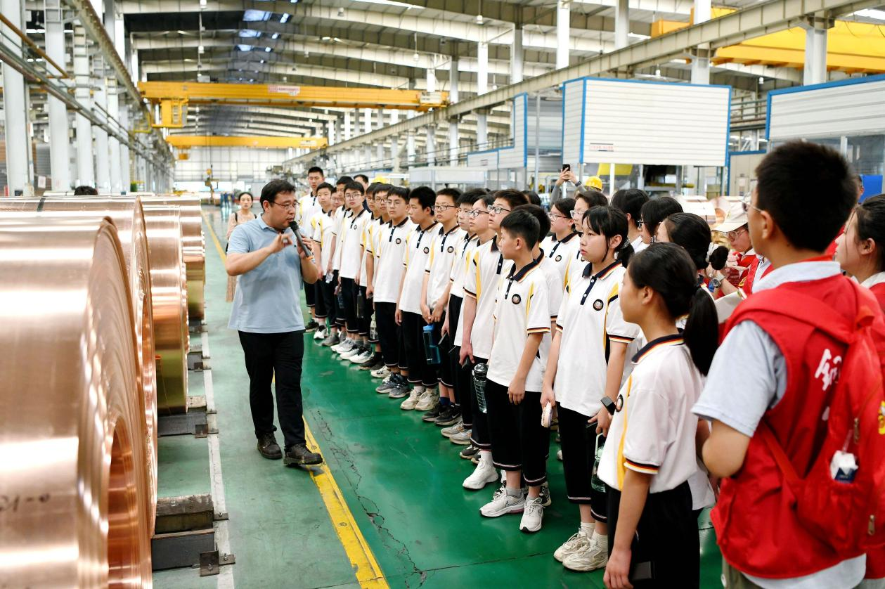 2023年6月9日,在安徽某公司銅板帶制造車間,銅陵市第七中學(xué)學(xué)生在上“行走的思政課”。