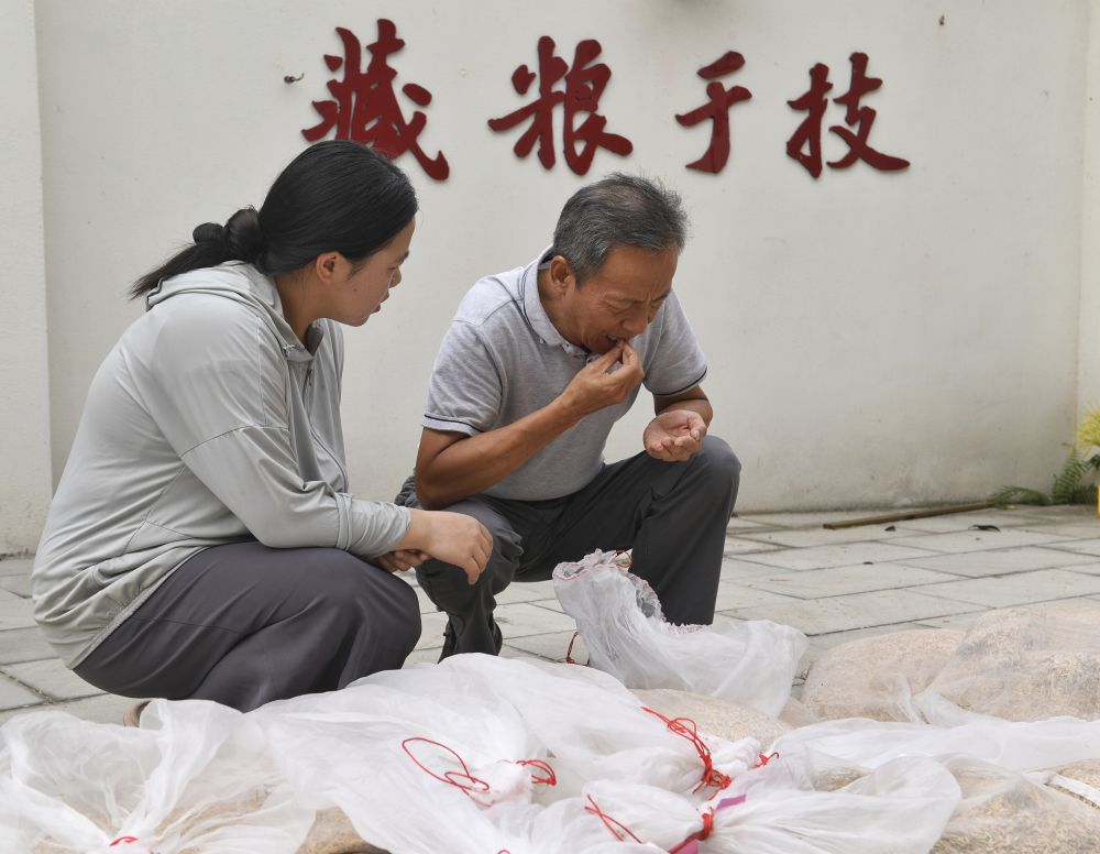 2024年8月22日,在永豐村水稻科技小院,長期駐守在此的四川農(nóng)業(yè)大學學生測量稻谷含水量。