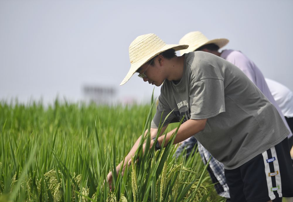 2024年7月26日,長期在永豐村高標準農(nóng)田駐守的四川農(nóng)業(yè)大學學生在田間觀察水稻生長情況。