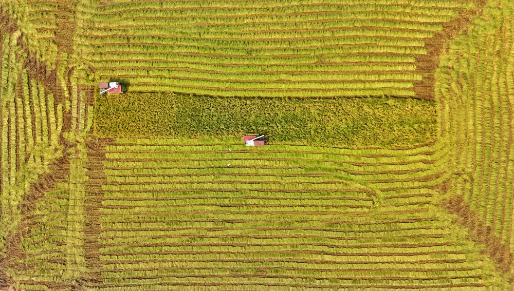 2024年8月22日,收割機在永豐村高標準農(nóng)田內(nèi)收割水稻(無人機照片)。團隊預計,2024年永豐村高標準農(nóng)田平均畝產(chǎn)將接近800公斤。