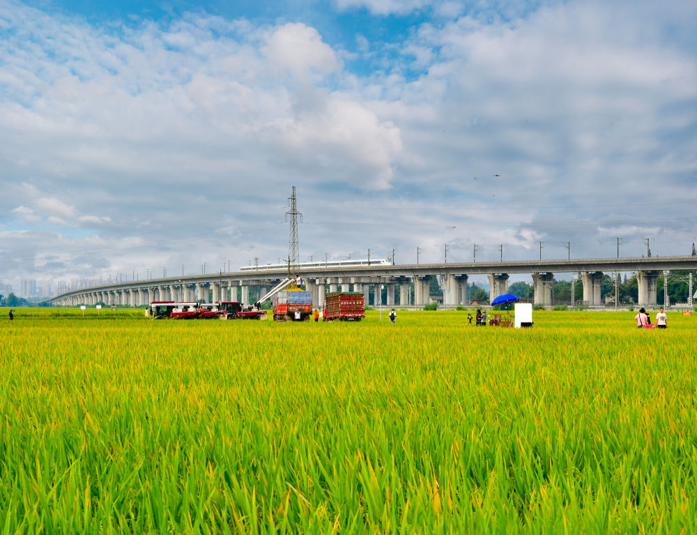 2023年8月28日,收割機在永豐村高標準農(nóng)田內(nèi)收割水稻。十多年來,科研團隊從500余個省內(nèi)外優(yōu)良品種中篩選出29個適合當?shù)胤N植的高產(chǎn)、優(yōu)質(zhì)、宜機化品種在眉山當?shù)卮竺娣e應用。