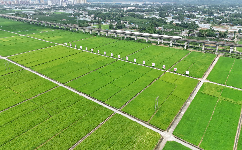 2024年7月26日,一列高鐵列車從永豐村高標準農(nóng)田上方的高架橋上疾馳而過(無人機照片)。過去,永豐村的農(nóng)田不少是“巴掌田”“雞爪田”,如今,細碎零散的耕地變成了“田成方、土成型、渠成網(wǎng)、路相通、溝相連”的高標準農(nóng)田,連片農(nóng)田實現(xiàn)了全程機械化種植。
