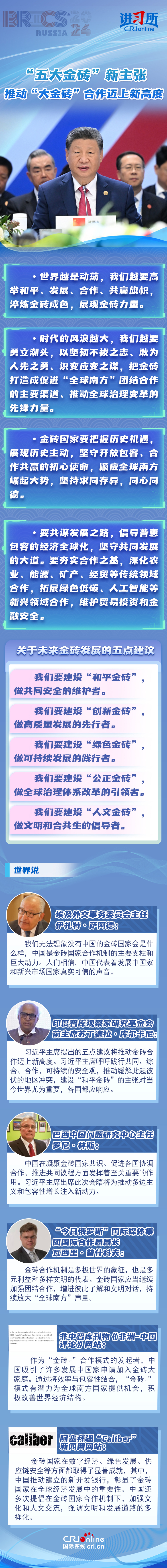 “時代的風浪越大,我們越要勇立潮頭,以堅韌不拔之志、敢為人先之勇、識變應變之謀,把金磚打造成促進‘全球南方’團結合作的主要渠道、推動全球治理變革的先鋒力量?!碑數貢r間10月23日,習近平主席在俄羅斯喀山出席金磚國家領導人第十六次會晤并發(fā)表重要講話,提出共建“和平金磚”“創(chuàng)新金磚”“綠色金磚”“公正金磚”“人文金磚”,為“大金磚合作”擘畫藍圖。