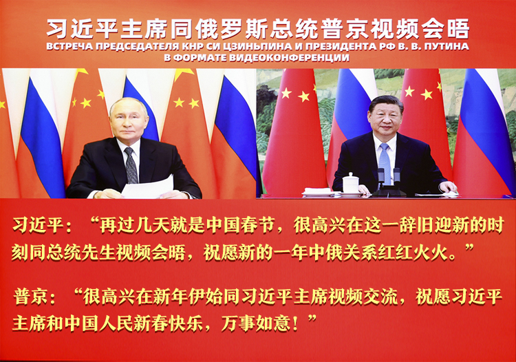 1月21日,中國國家主席習近平在北京同俄羅斯總統(tǒng)普京舉行視頻會晤,兩國元首互致新年祝福。習近平強調(diào),新的一年,我愿同總統(tǒng)先生一道,繼續(xù)引領中俄關系登高望遠,以中俄關系的穩(wěn)定性和堅韌性應對外部環(huán)境的不確定性,共同促進兩國發(fā)展振興,維護國際公平正義。