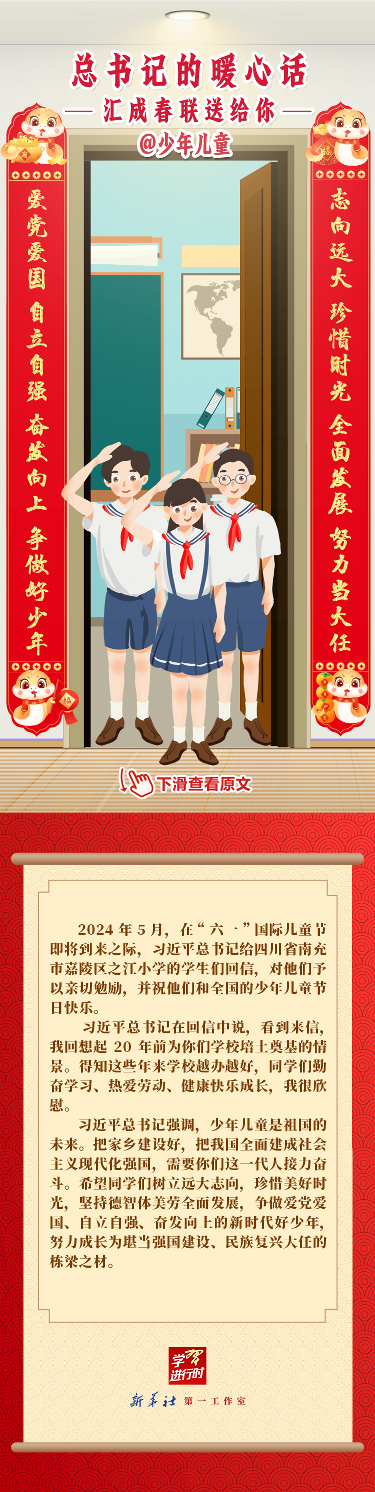 【學(xué)習(xí)進行時】過春節(jié),貼春聯(lián),寄托人們對新年的美好愿望。過去一年,習(xí)近平總書記在不同場合點贊各行各業(yè)奮斗者,說了許多暖心話。新春之際,我們匯編成聯(lián),向新征程上的每一位“主角”致敬,送上新春的祝福。