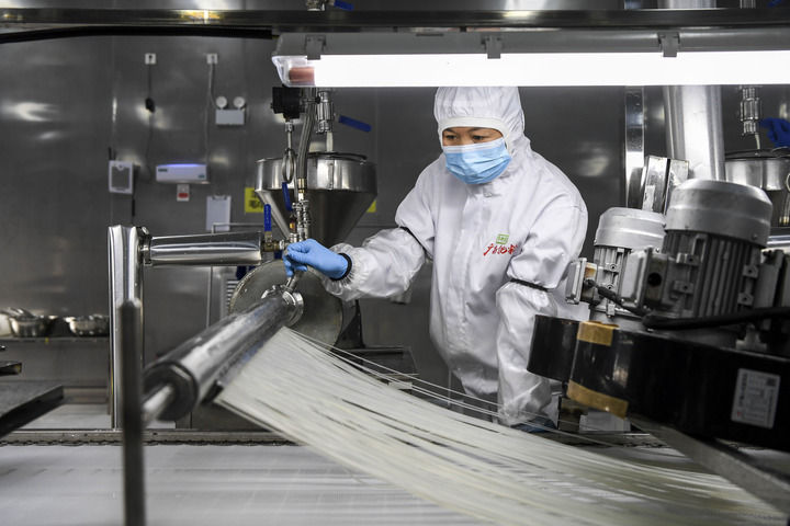 在廣西柳州市一家螺螄粉生產企業(yè),工作人員在查看米粉的生產情況(2024年12月13日攝)。新華社記者 曹祎銘 攝