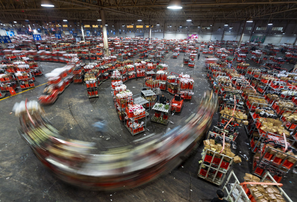 2023年1月31日,臺(tái)車(chē)在昆明國(guó)際花卉拍賣(mài)交易中心運(yùn)輸鮮花。