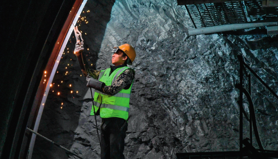 中鐵二十局的工人在西渝高鐵康渝段明燈山隧道內(nèi)施工(2025 年 1 月 15 日攝) 王曦攝 / 本刊