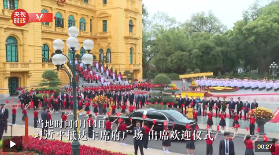 4月14日,中共中央總書記、國家主席習(xí)近平抵達(dá)河內(nèi)對(duì)越南進(jìn)行國事訪問。當(dāng)日下午,越共中央總書記蘇林為習(xí)近平舉行隆重歡迎儀式。