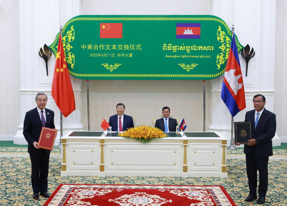 4月17日晚,國家主席習(xí)近平同柬埔寨首相洪瑪奈在金邊和平大廈舉行會(huì)談。這是會(huì)談后,兩國領(lǐng)導(dǎo)人共同見證中柬雙方交換雙邊合作文本。新華社記者 王曄 攝