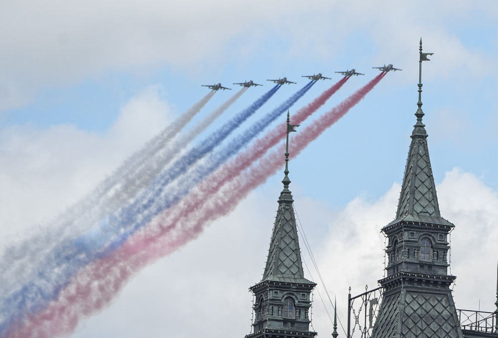 5月9日,在俄羅斯首都莫斯科,參加紀(jì)念蘇聯(lián)偉大衛(wèi)國戰(zhàn)爭勝利80周年閱兵式的戰(zhàn)機(jī)編隊拉煙飛行。新華社記者 賴向東 攝