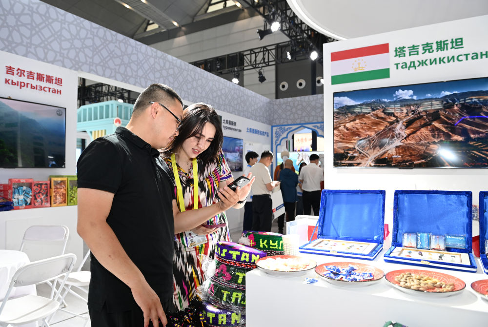 2025年5月21日,在第九屆絲綢之路國際博覽會暨中國東西部合作與投資貿(mào)易洽談會絲路優(yōu)品展上,參觀者了解塔吉克斯坦商品。新華社記者 李一博 攝