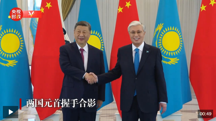 當?shù)貢r間6月16日下午,國家主席習(xí)近平乘車抵達阿斯塔納總統(tǒng)府,托卡耶夫總統(tǒng)在下車處迎接。會談前,兩國元首握手合影。
