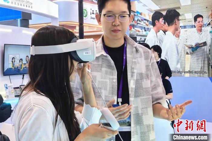 6月7日,在第四屆中國(南昌)國際大健康產(chǎn)業(yè)大會暨博覽會現(xiàn)場,一位觀眾體驗香港理工大學推出的虛擬步行訓練系統(tǒng)。中新社記者 吳鵬泉 攝