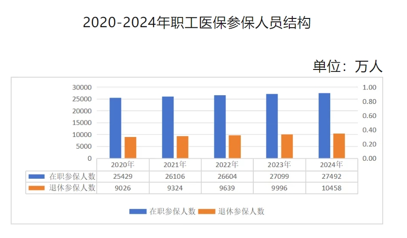 公報(bào)顯示,截至2024年底,職工醫(yī)保參保37948.34萬人,比上年增加853.70萬人,增長2.3%。其中在職職工27491.84萬人,退休職工10457.50萬人。