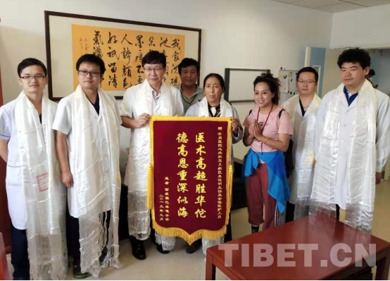 這是強(qiáng)巴卓嘎(右四)術(shù)后出院時,將一面錦旗送到北京安貞醫(yī)院心外科主任朱俊明(左三)手中,以感謝朱俊明與他的醫(yī)療團(tuán)隊的救命之恩。(邊巴次仁2019年9月30日攝)
