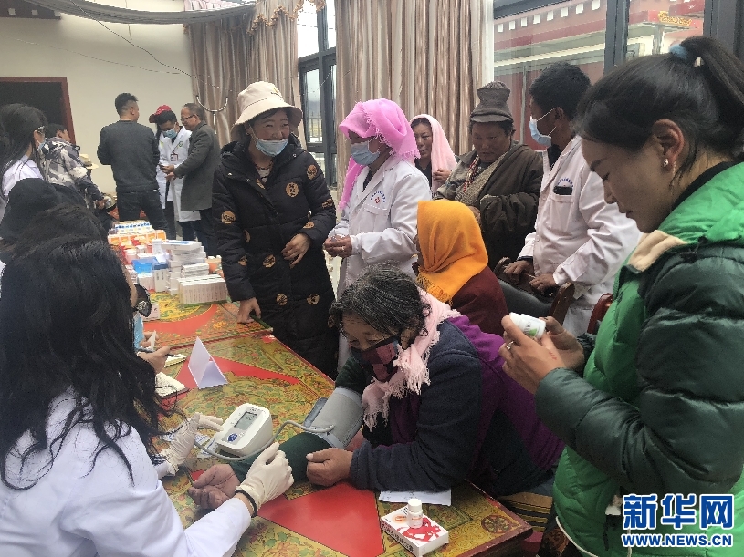 援藏醫(yī)生為村民量血壓 新華網(wǎng)發(fā)(王宇翀攝)