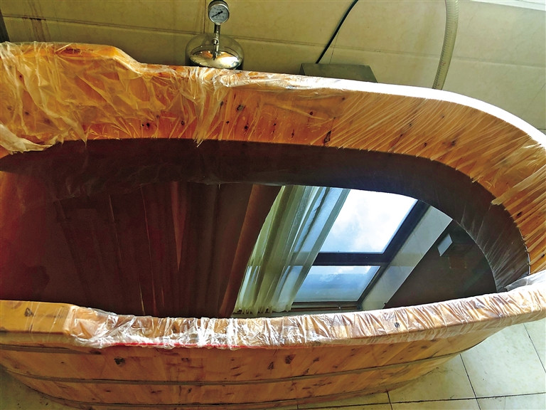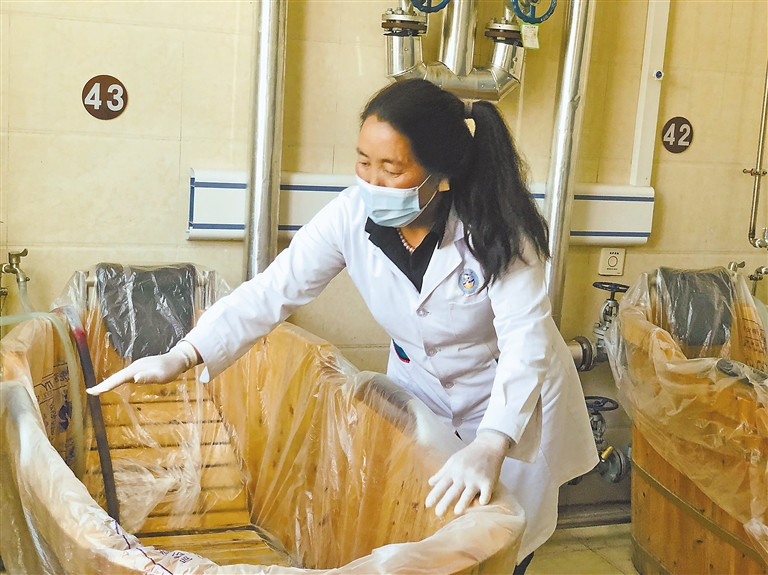 西藏自治區(qū)藏醫(yī)院藏醫(yī)藥浴中心工作人員正在更換一次性木桶套?! ?/p>