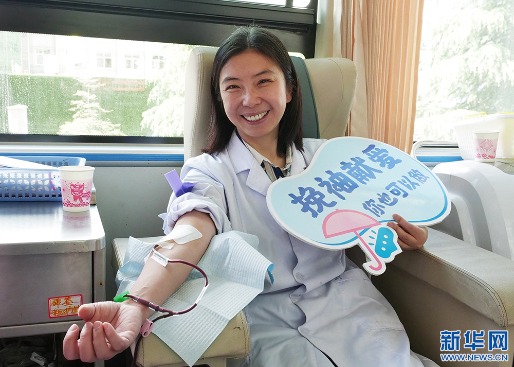 5月27日,來自北京協(xié)和醫(yī)院的援藏專家楊筱在獻(xiàn)血。(新華網(wǎng) 旦增努布攝)