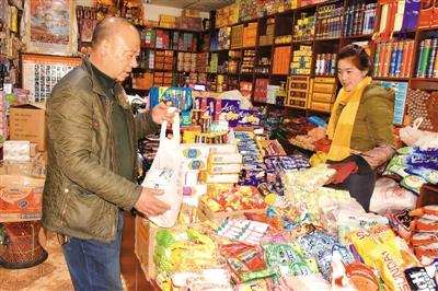 圖為沖賽康居委會(huì)黨支部書(shū)記拉珍在“扶貧愛(ài)心超市”里核實(shí)居民賬戶和兌換的東西。