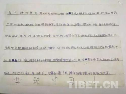 現在的我,是一名陽光快樂的兒童,在學校,我努力學習,團結同學,積極幫助他人,經常參加學校組織的各項活動,你們的救助,不僅讓我得到快樂的童年,也讓我們一家人感到格外幸福,非常感謝你們,我一定努力學習,做個對社會有用的人,祝你們新年快樂,萬事如意!也請你到若爾蓋到我家做客。