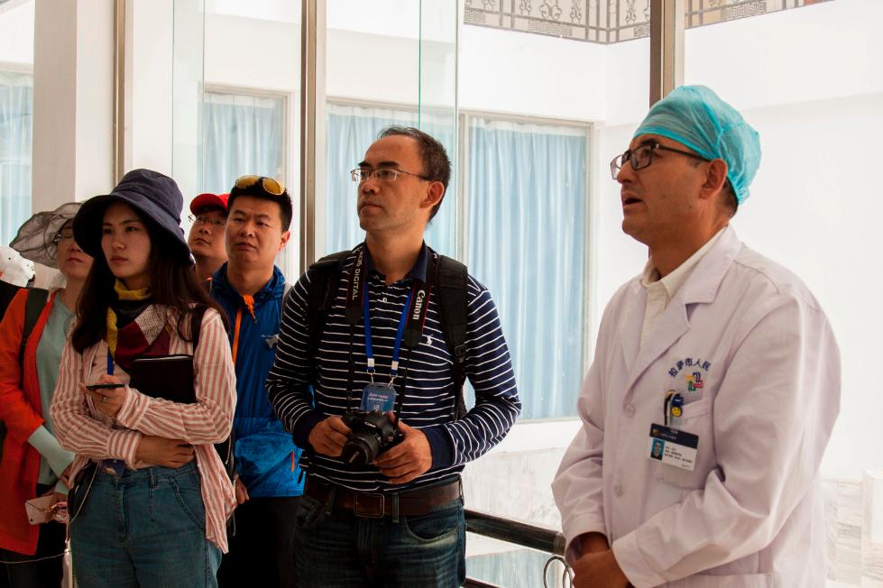 圖為拉薩市人民醫(yī)院重癥醫(yī)學科主任達瓦向記者們介紹醫(yī)院的援藏情況。