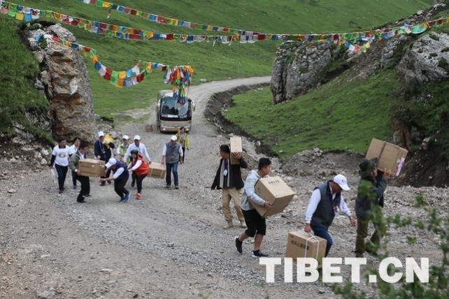 遇到車輛走不過(guò)去的地方,溫建民和同事們一起搬運(yùn)藥品等。