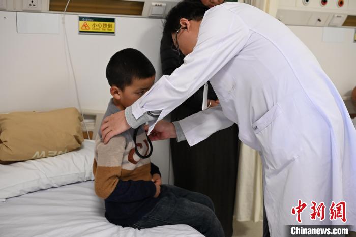 圖為北京協(xié)和醫(yī)院心外科副主任、副主任醫(yī)師張超紀為患兒尼瑪(化名)初步檢查身體情況?!≈行律缬浾?徐雪瑩 攝
