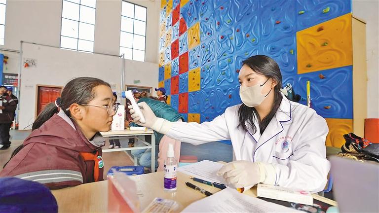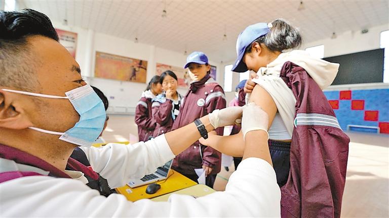 接種疫苗后,醫(yī)生在留觀區(qū)為學(xué)生測量體溫。 記者 格桑倫珠 攝