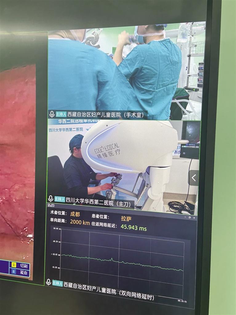 梅玲介紹,此次手術(shù)是與四川大學華西第二醫(yī)院聯(lián)合開展的,由四川大學華西第二醫(yī)院的鄭瑩教授團隊主刀,并依托華西的先進技術(shù)平臺,通過遠程方式完成手術(shù)。手術(shù)結(jié)束后,鄭瑩教授通過視頻向大家介紹,這場跨越2000公里距離與3000米海拔差異的手術(shù),總共用時1小時45分鐘,網(wǎng)絡延遲僅40毫秒。“此次手術(shù)的成功為今后更多優(yōu)質(zhì)資源技術(shù)送達偏遠地區(qū)提供了重要參考,也為提高西藏醫(yī)療水平打下了堅實的基礎?!编崿撜f。