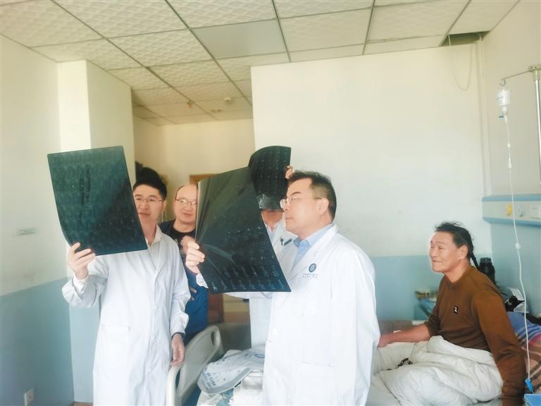 南方醫(yī)科大學(xué)第三附屬醫(yī)院院長(zhǎng)黎程(右二)查看患者X光片?! ?/p>