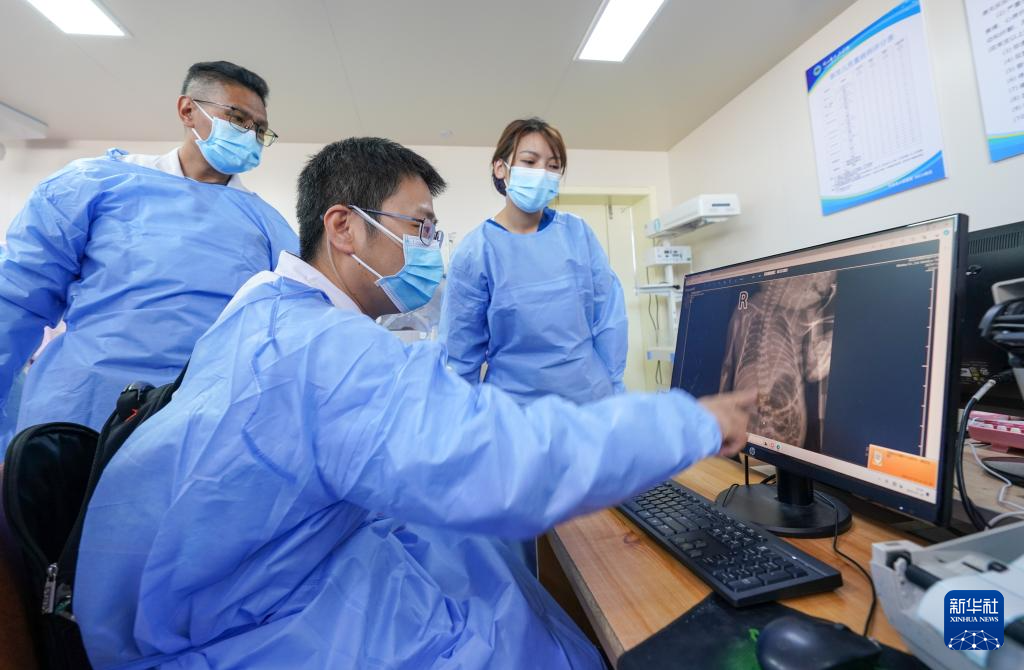 7月18日,來自大連醫(yī)科大學(xué)附屬第一醫(yī)院的援藏醫(yī)生田聰亮(左二)和同事在那曲市人民醫(yī)院查房。新華社記者 晉美多吉 攝?